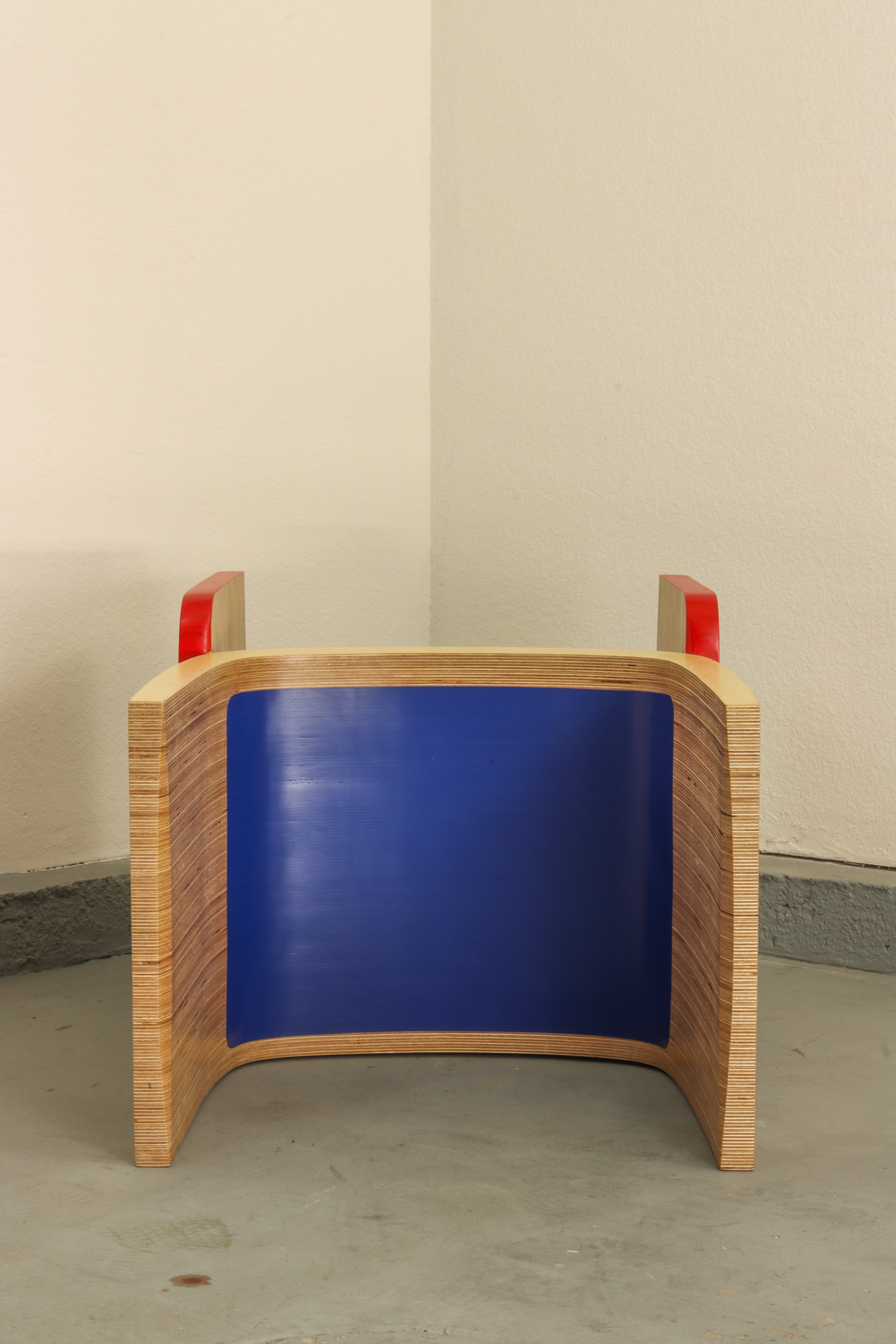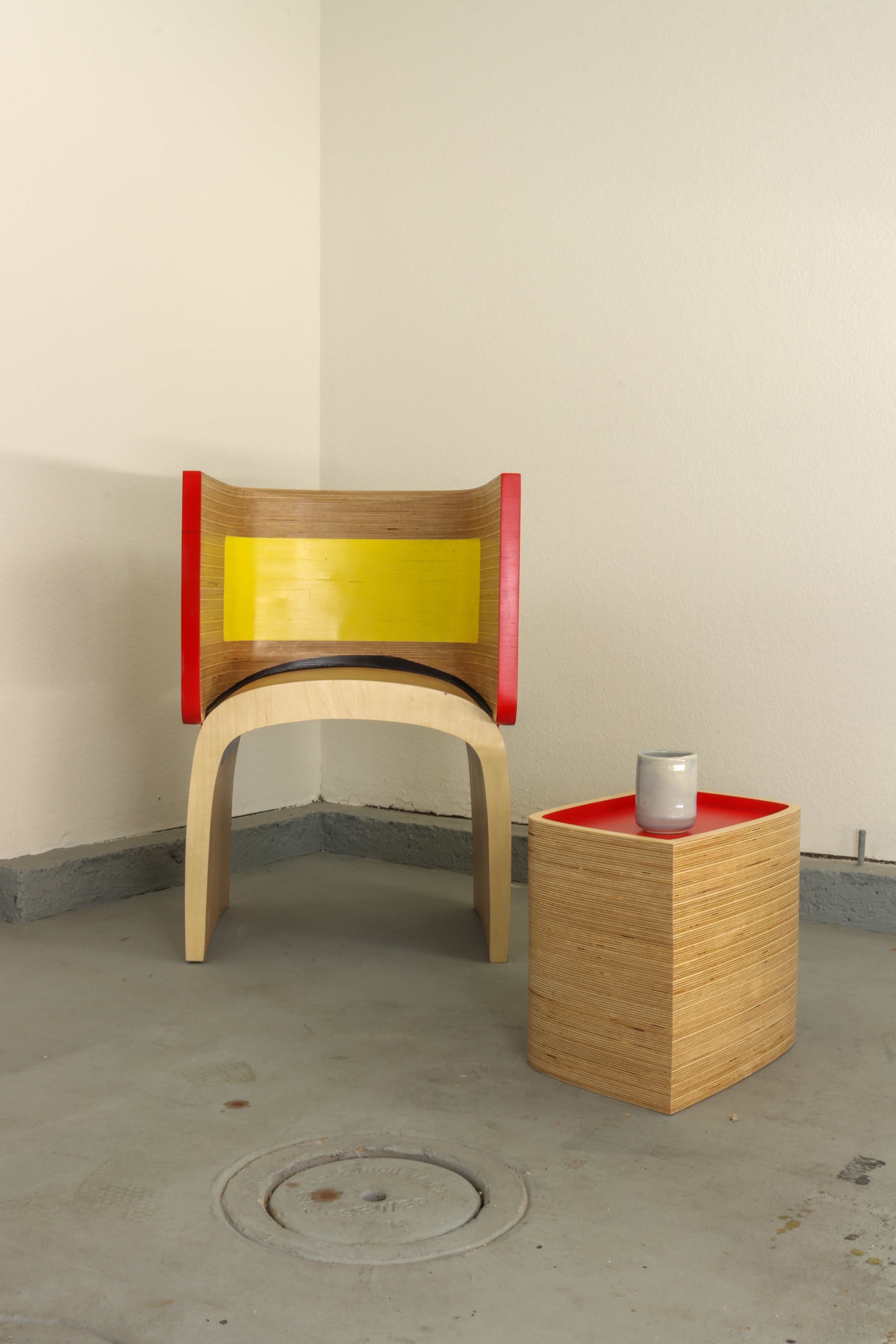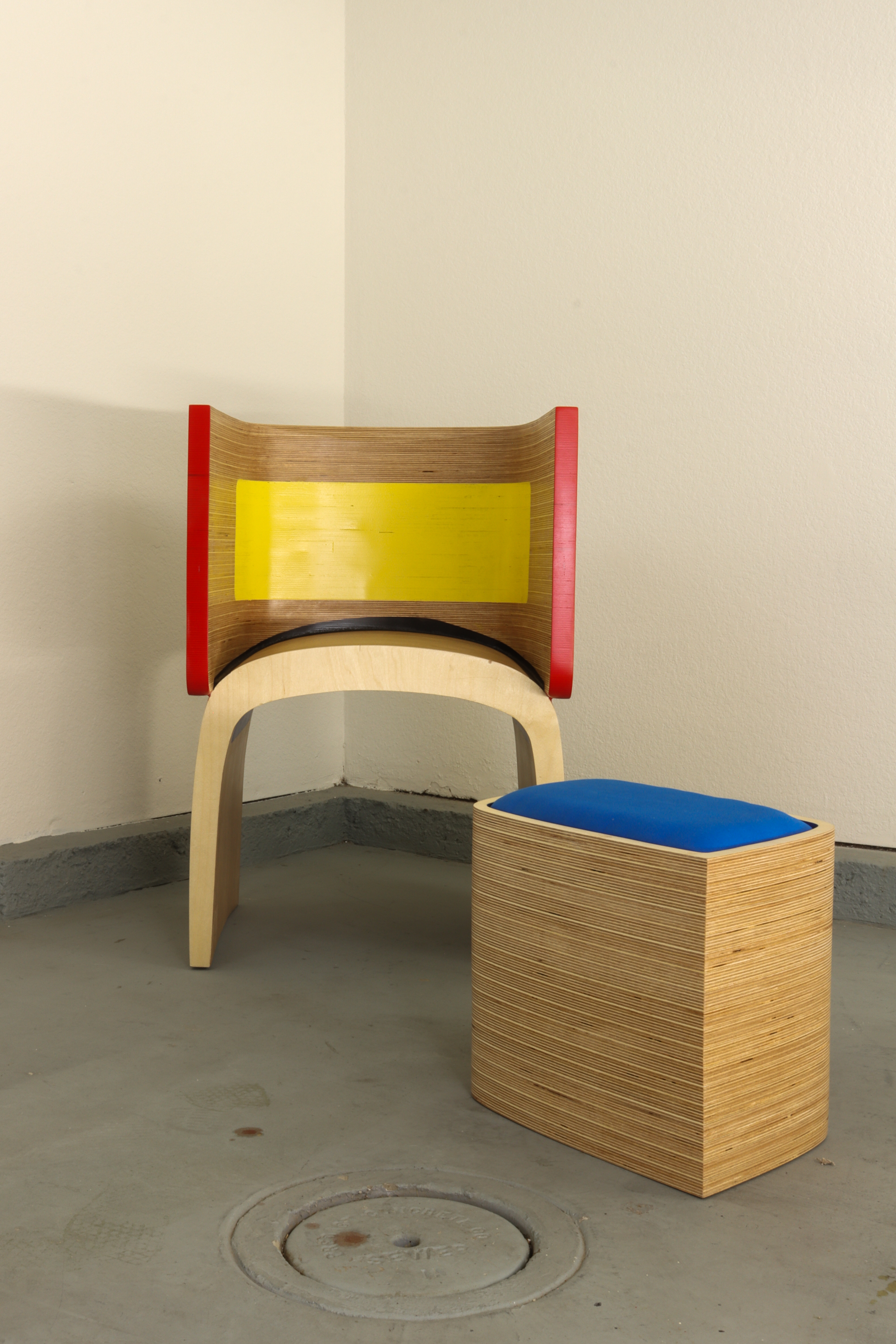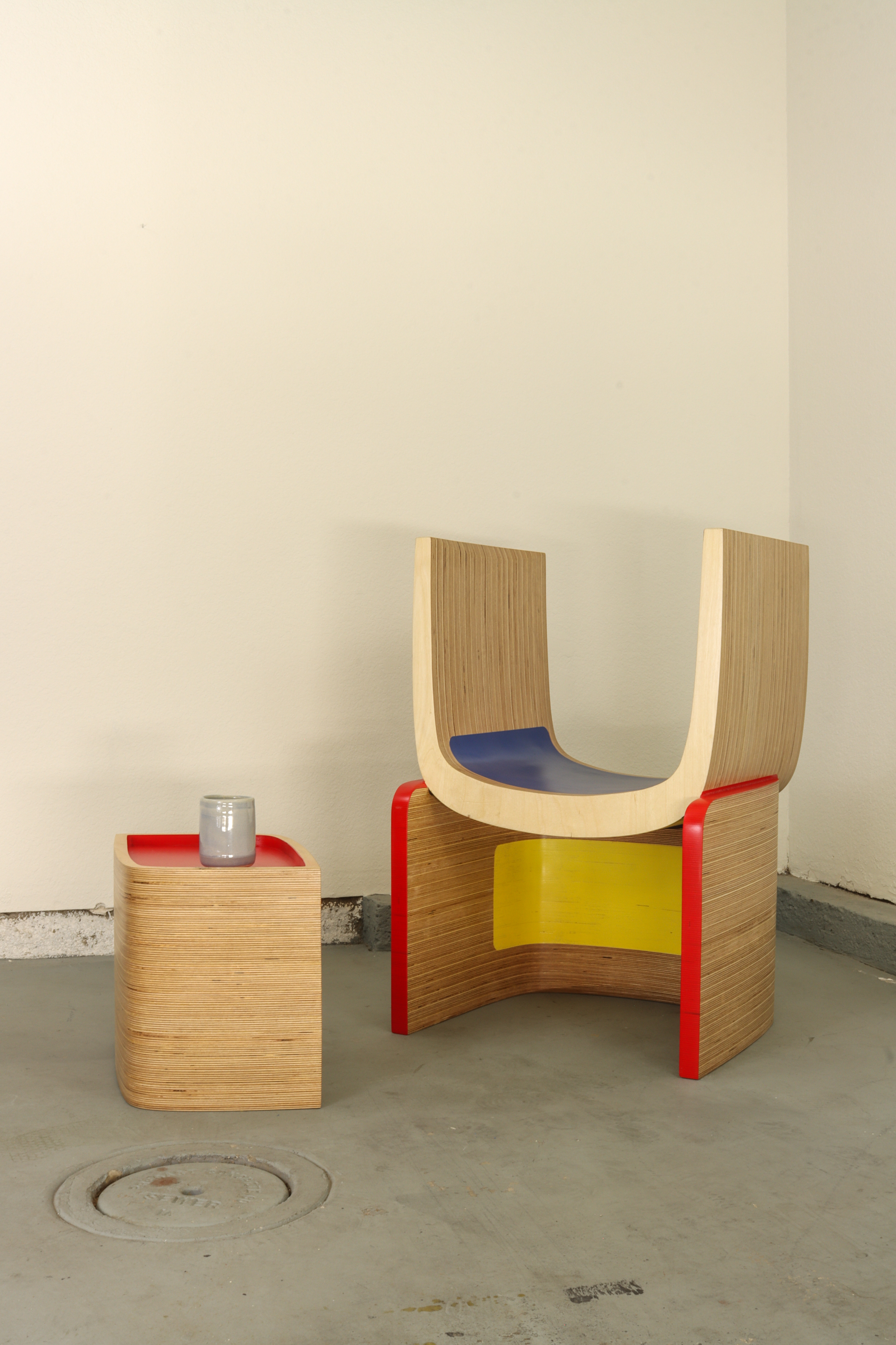 This small set of furniture was designed entirely out of 3/4" Baltic Birch plywood, and used exactly 3 sheets with minimal waste. The original concept for this piece was to design a robust seating arrangement. With this chair, one can sit in 6 different positions, depending on how the chair is oriented. The small side table/foot rest/stool was made out of the scraps left over from the larger U shapes, and is hollow on the interior for weight reduction. This piece can be sat on in two different orientations, used as a foot rest in two orientations, or be used as a side table. James was inspired by Dutch Modernism, and artists of the De Stijl movement, like Gerrit Rietveld, Piet Mondrian, and loosely, Kazimir Malevich. Gerrit Rietveld's furniture has been described as "the end of comfort", and all artists work comprises of the reduction of form and color to the basic and primary. These aspects were partially a guiding principal in this Plywood Set. Picture frame is made from an extra five layers of plywood rings from the side object. Artwork within frame created by Adriano D'Angelo.