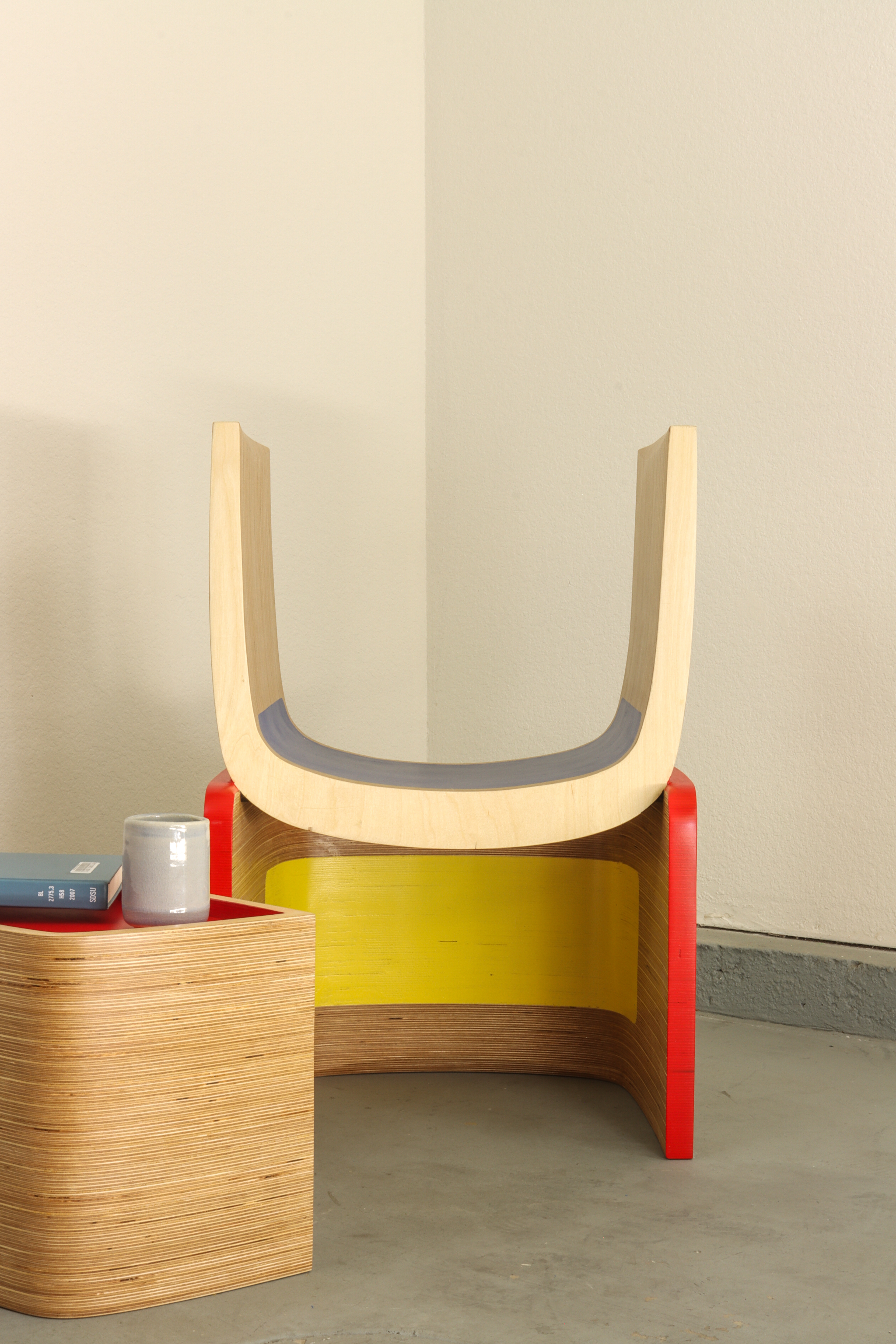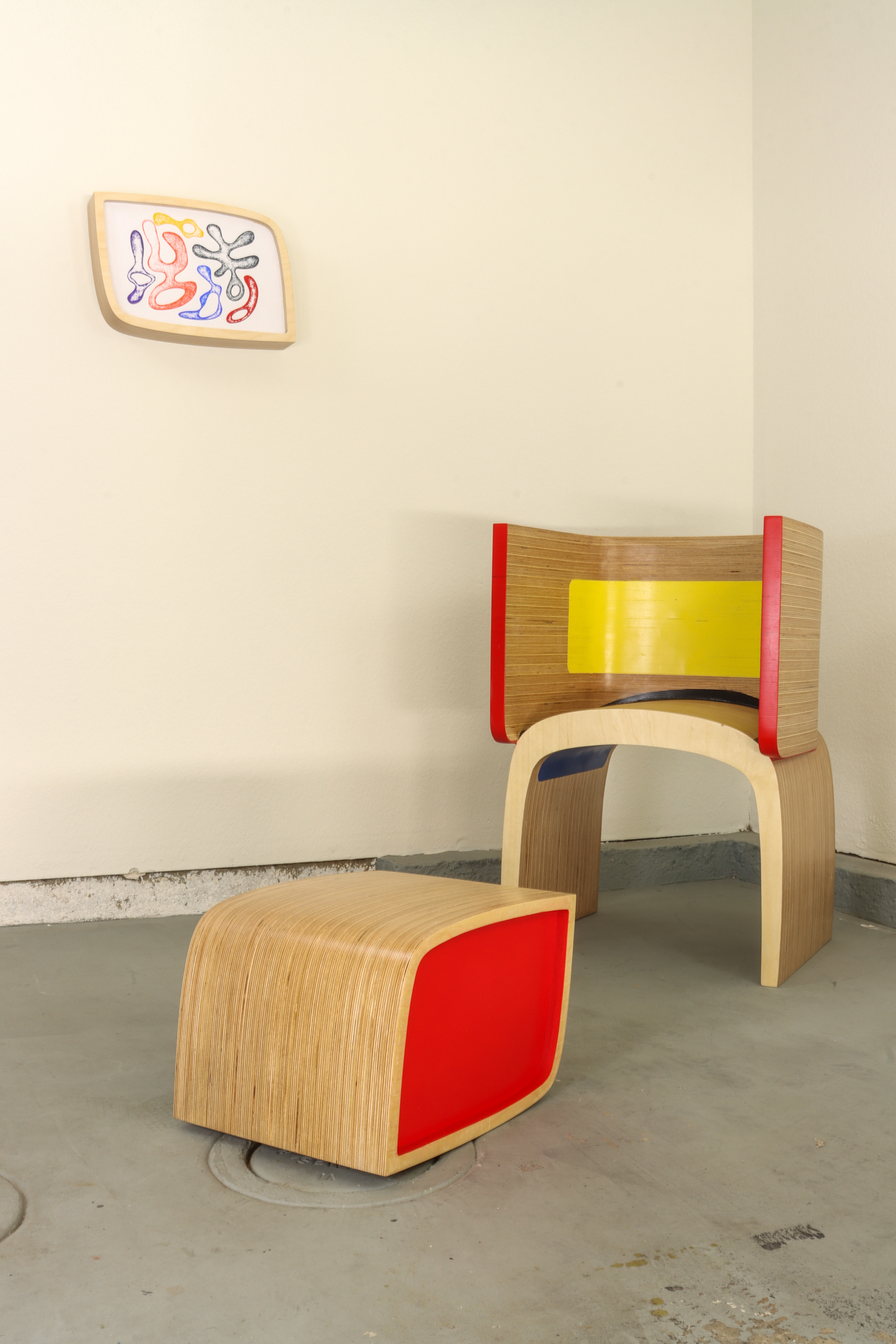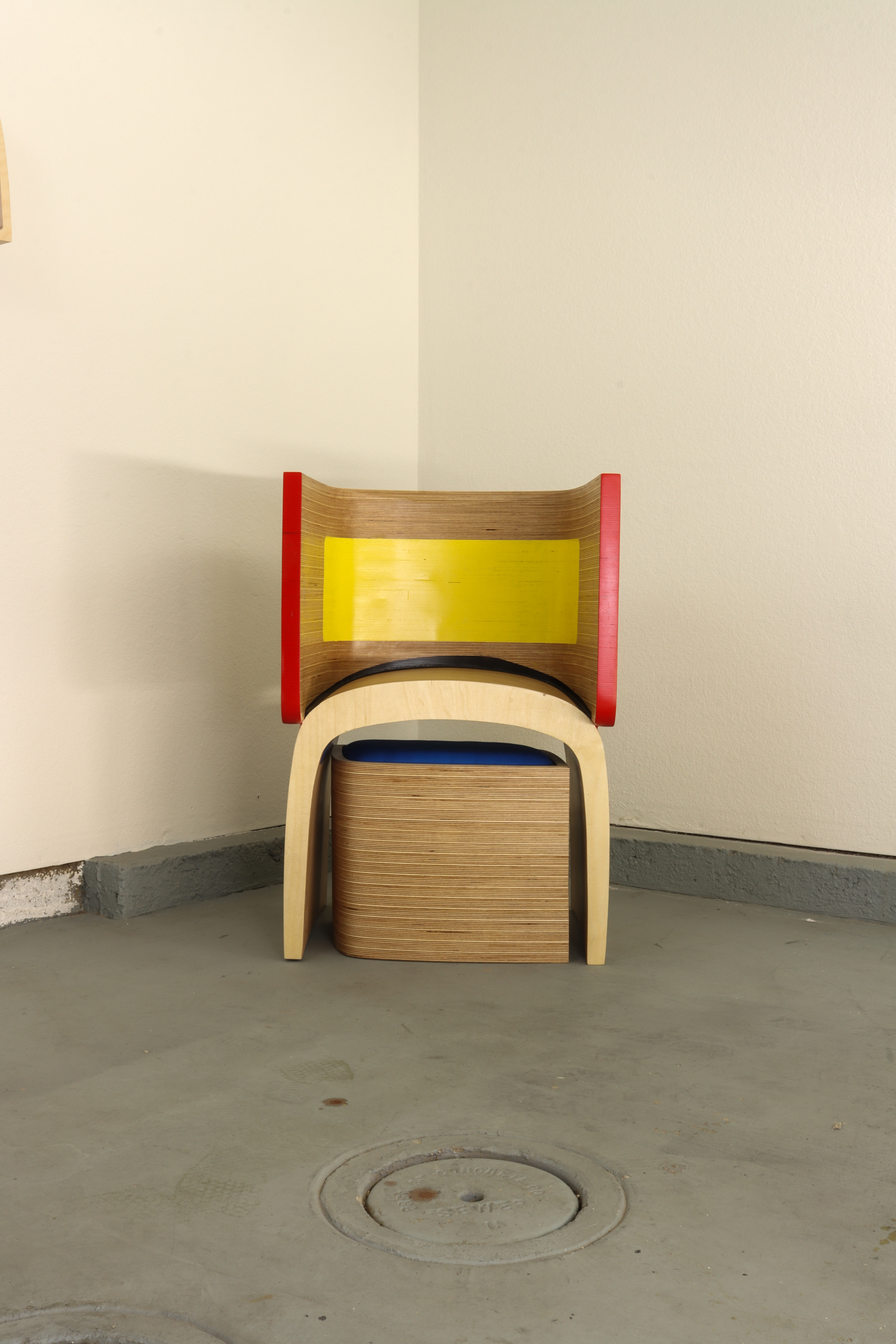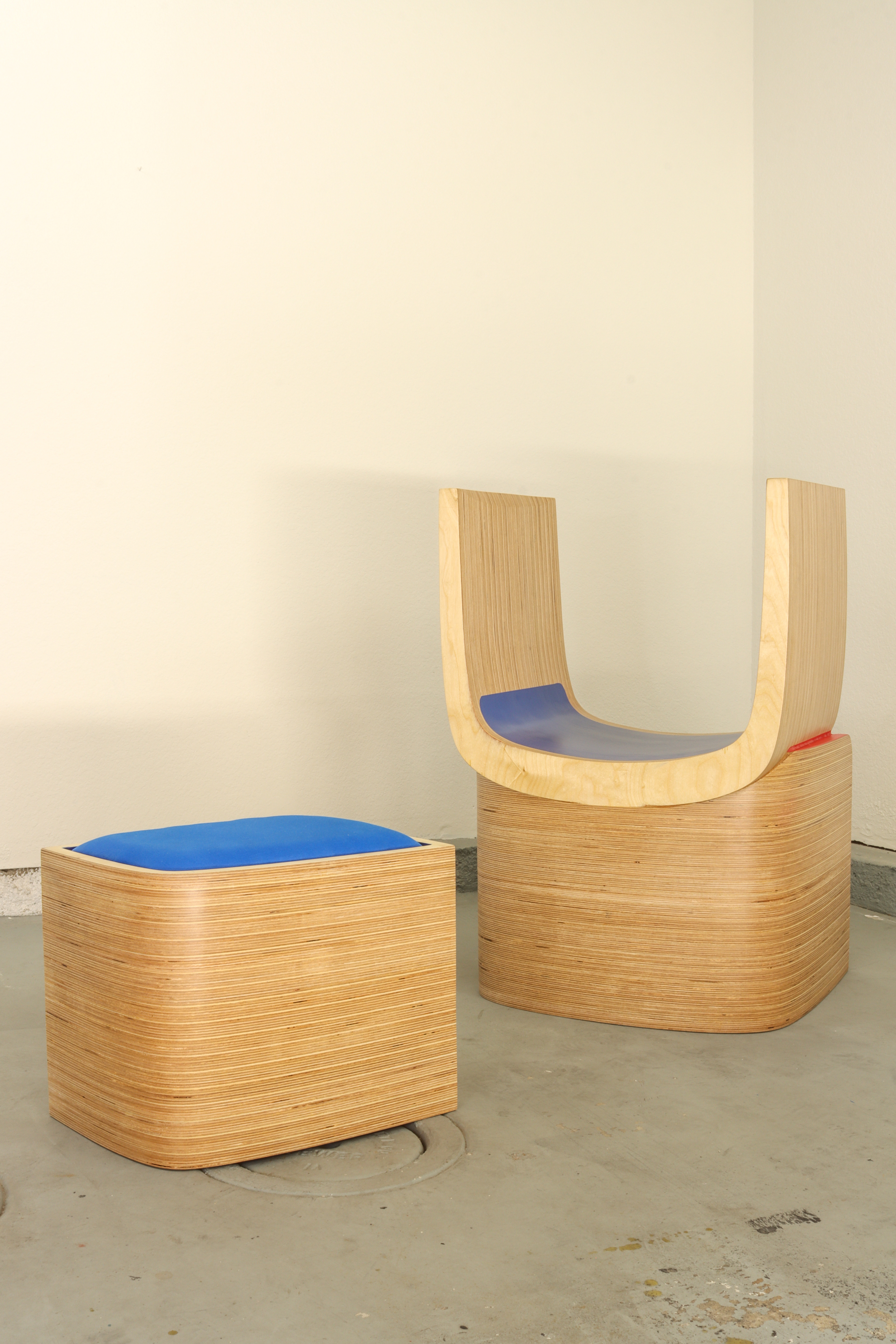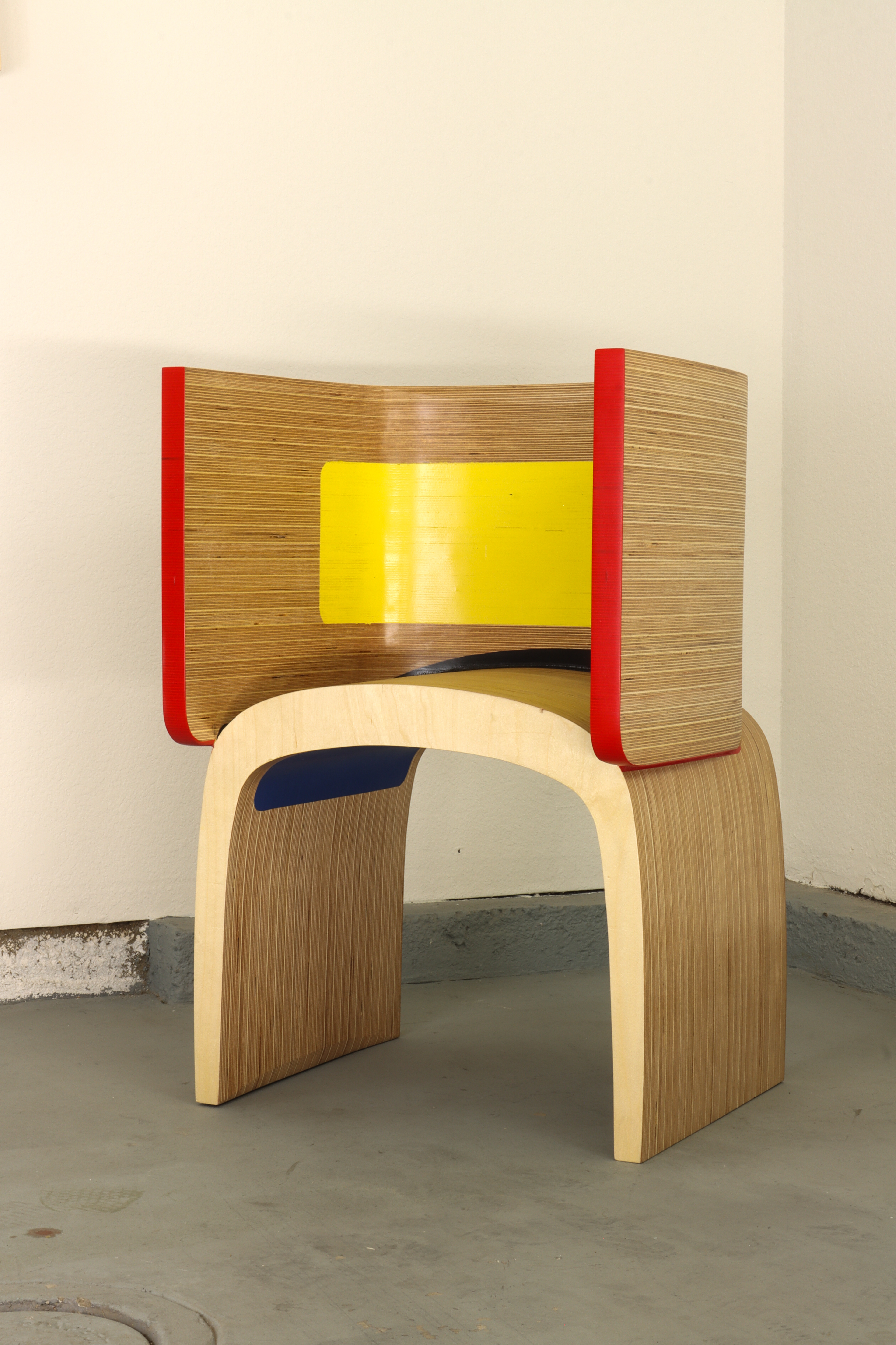 This small set of furniture was designed entirely out of 3/4" Baltic Birch plywood, and used exactly 3 sheets with minimal waste. The original concept for this piece was to design a robust seating arrangement. With this chair, one can sit in 6 different positions, depending on how the chair is oriented. The small side table/foot rest/stool was made out of the scraps left over from the larger U shapes, and is hollow on the interior for weight reduction. This piece can be sat on in two different orientations, used as a foot rest in two orientations, or be used as a side table. James was inspired by Dutch Modernism, and artists of the De Stijl movement, like Gerrit Rietveld, Piet Mondrian, and loosely, Kazimir Malevich. Gerrit Rietveld's furniture has been described as "the end of comfort", and all artists work comprises of the reduction of form and color to the basic and primary. These aspects were partially a guiding principal in this Plywood Set. Picture frame is made from an extra five layers of plywood rings from the side object. Artwork within frame created by Adriano D'Angelo.