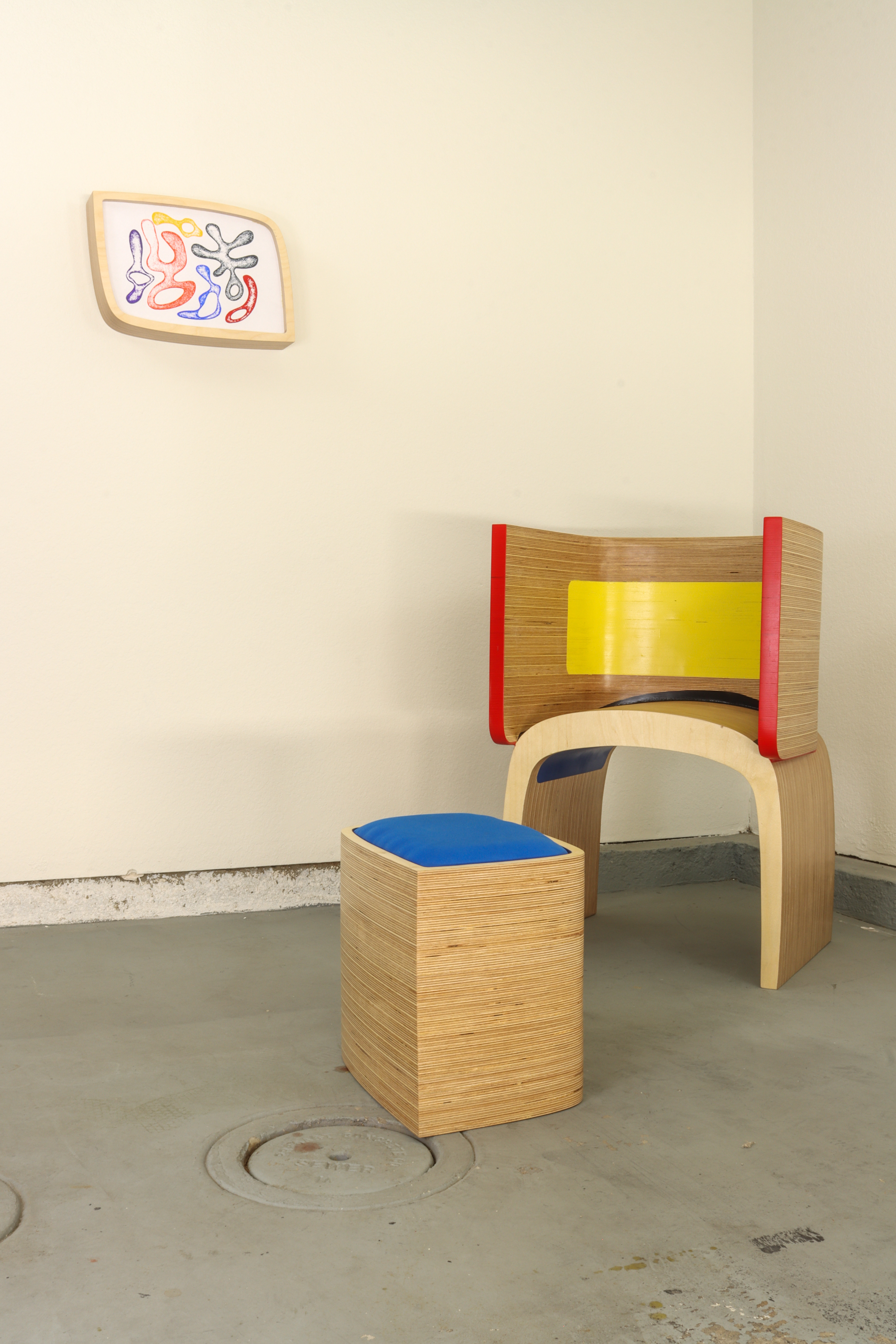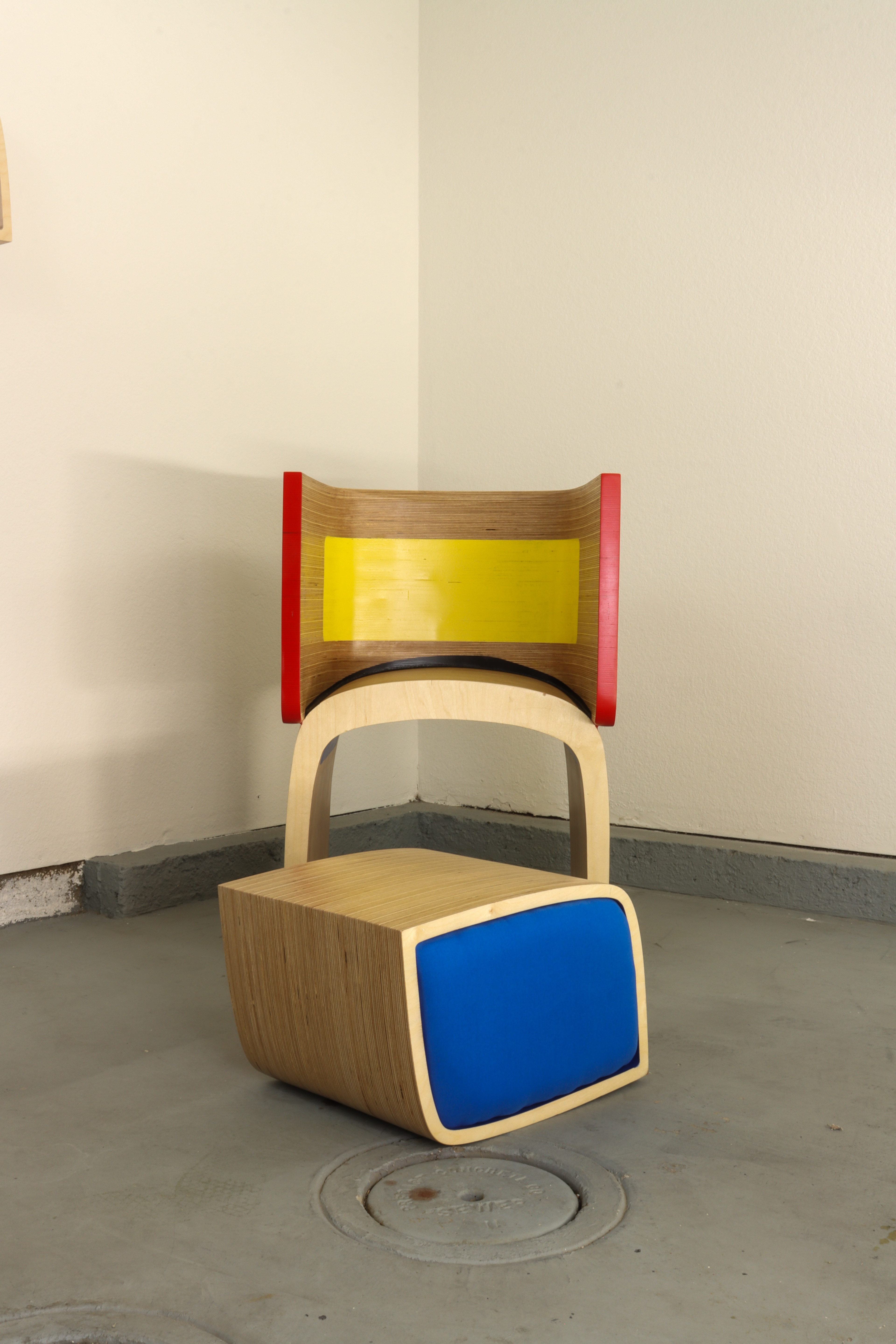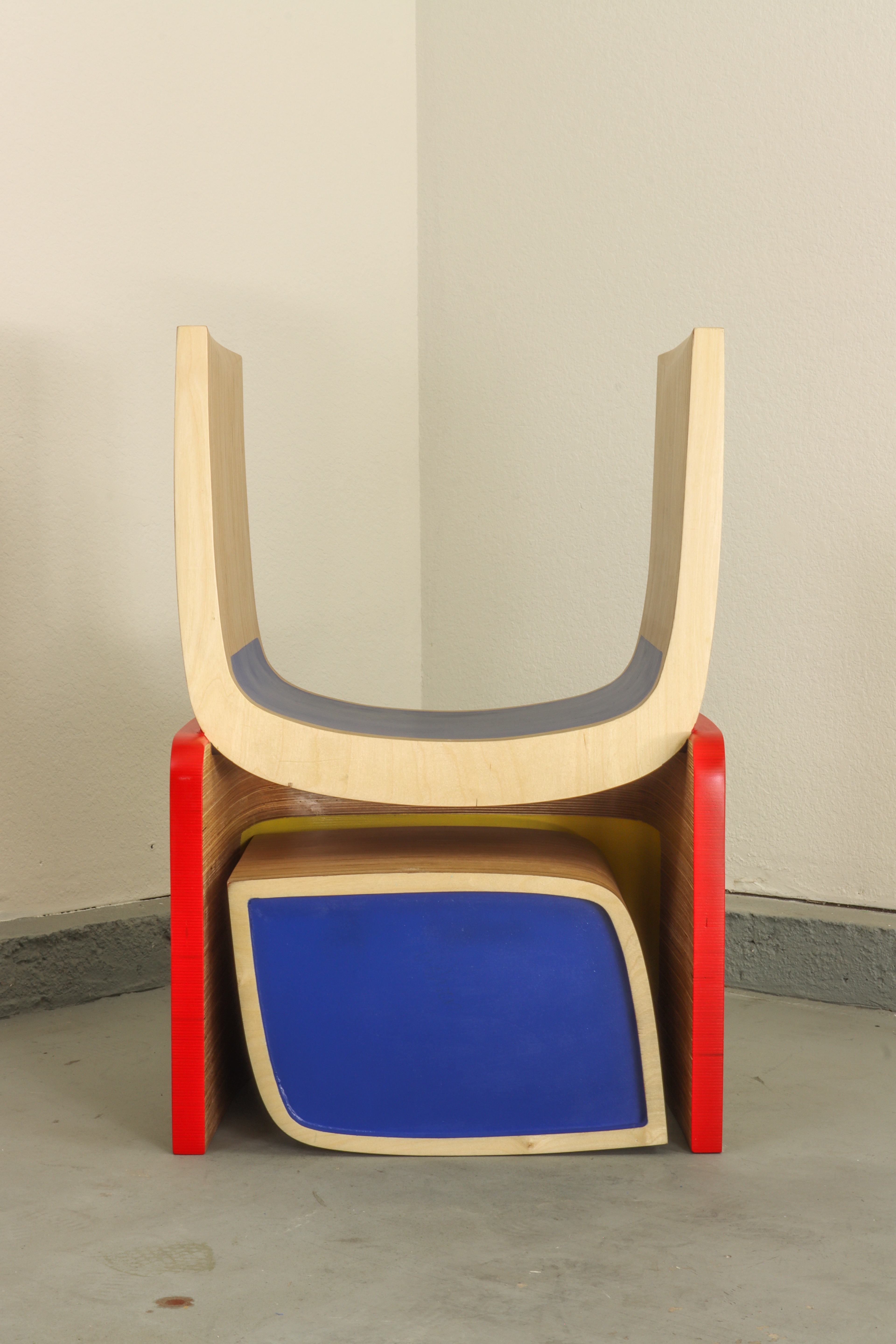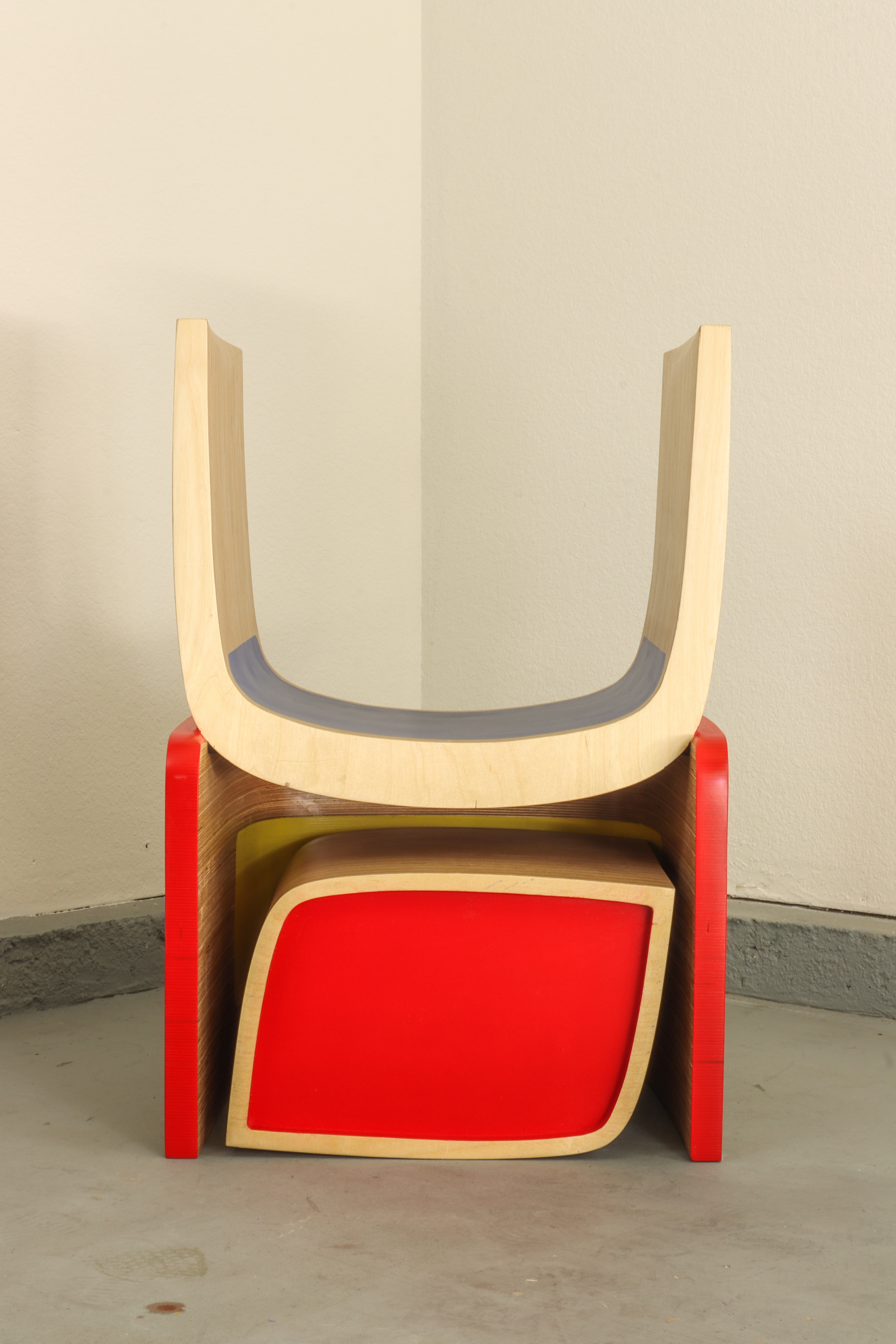 This small set of furniture was designed entirely out of 3/4" Baltic Birch plywood, and used exactly 3 sheets with minimal waste. The original concept for this piece was to design a robust seating arrangement. With this chair, one can sit in 6 different positions, depending on how the chair is oriented. The small side table/foot rest/stool was made out of the scraps left over from the larger U shapes, and is hollow on the interior for weight reduction. This piece can be sat on in two different orientations, used as a foot rest in two orientations, or be used as a side table. James was inspired by Dutch Modernism, and artists of the De Stijl movement, like Gerrit Rietveld, Piet Mondrian, and loosely, Kazimir Malevich. Gerrit Rietveld's furniture has been described as "the end of comfort", and all artists work comprises of the reduction of form and color to the basic and primary. These aspects were partially a guiding principal in this Plywood Set. Picture frame is made from an extra five layers of plywood rings from the side object. Artwork within frame created by Adriano D'Angelo.