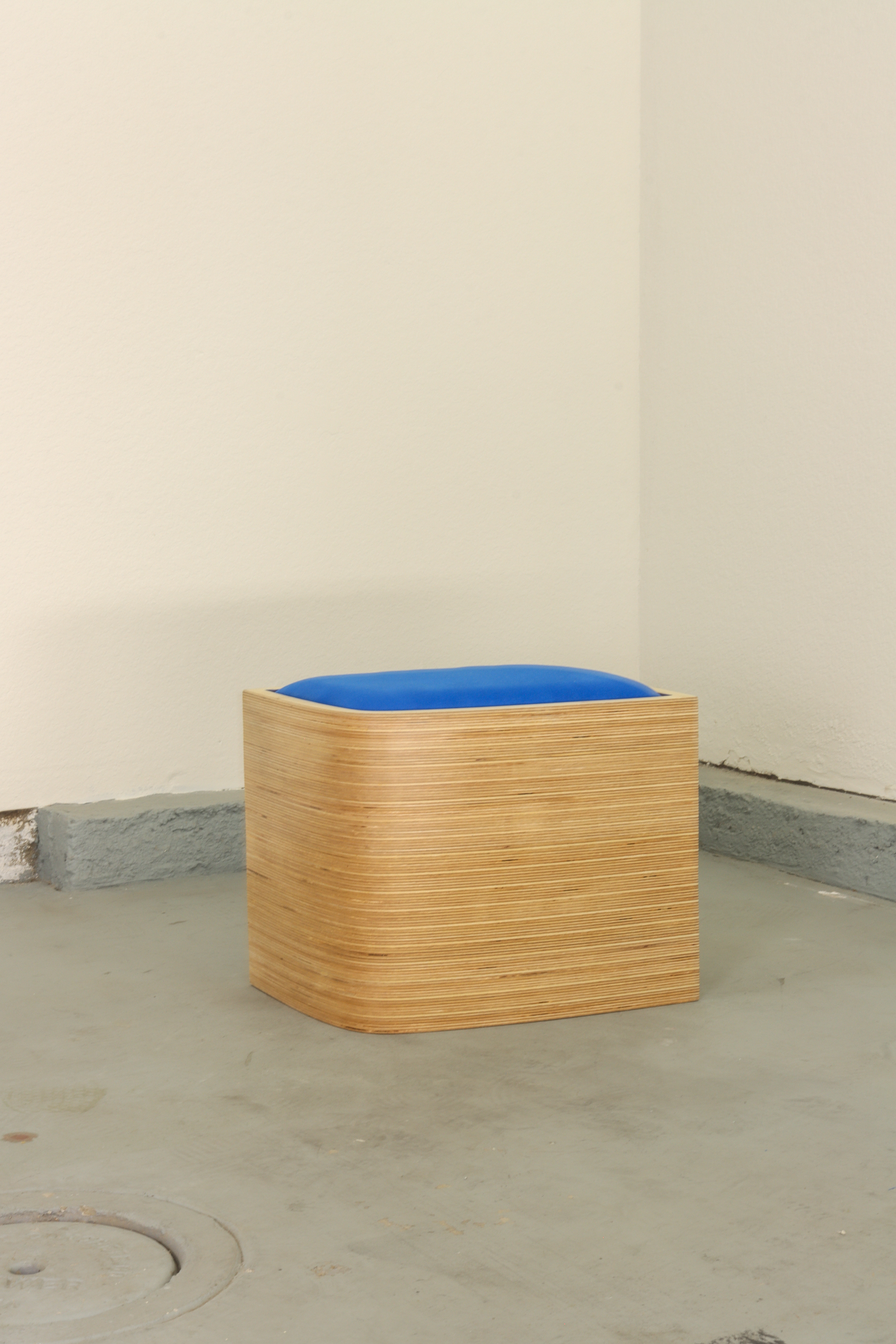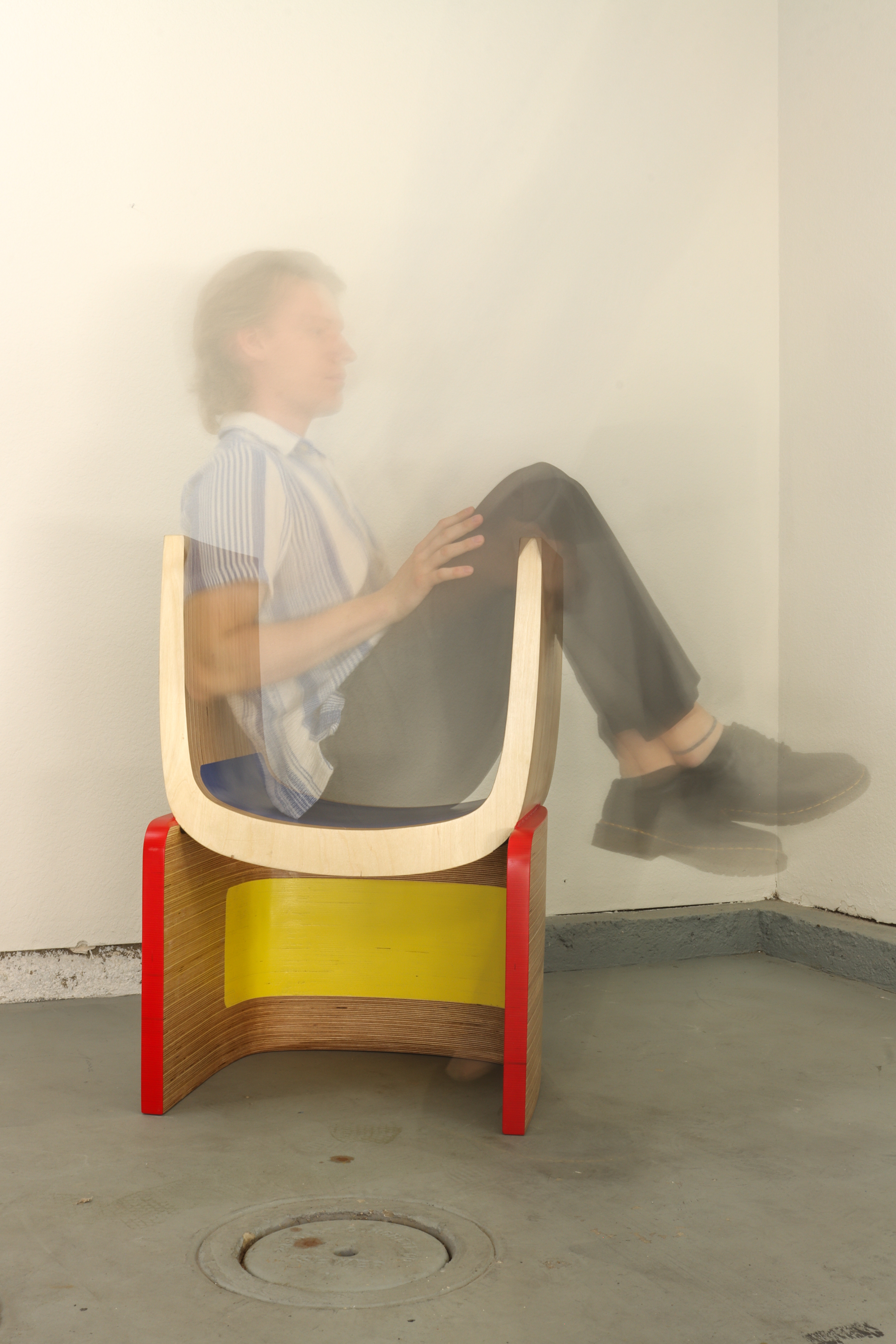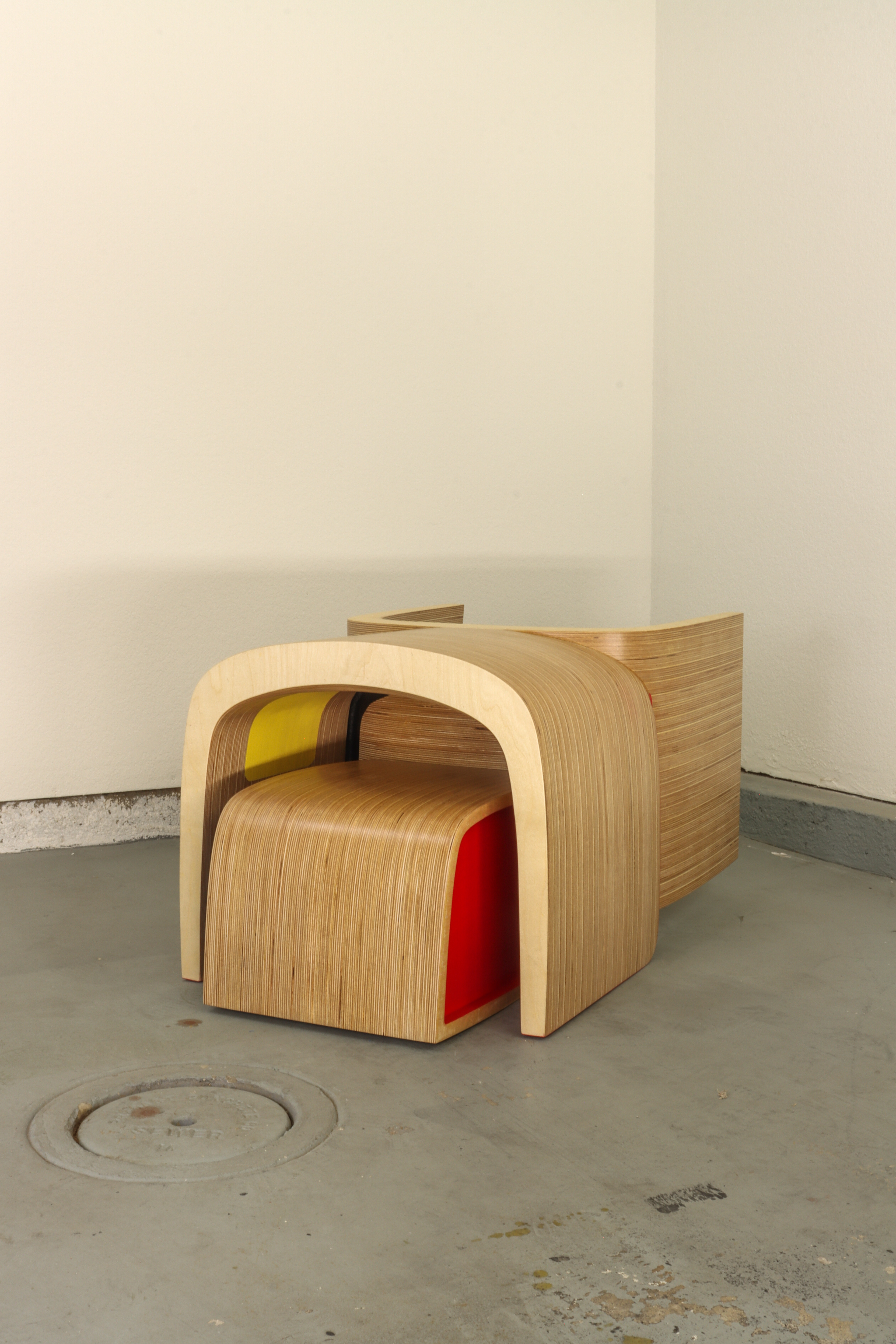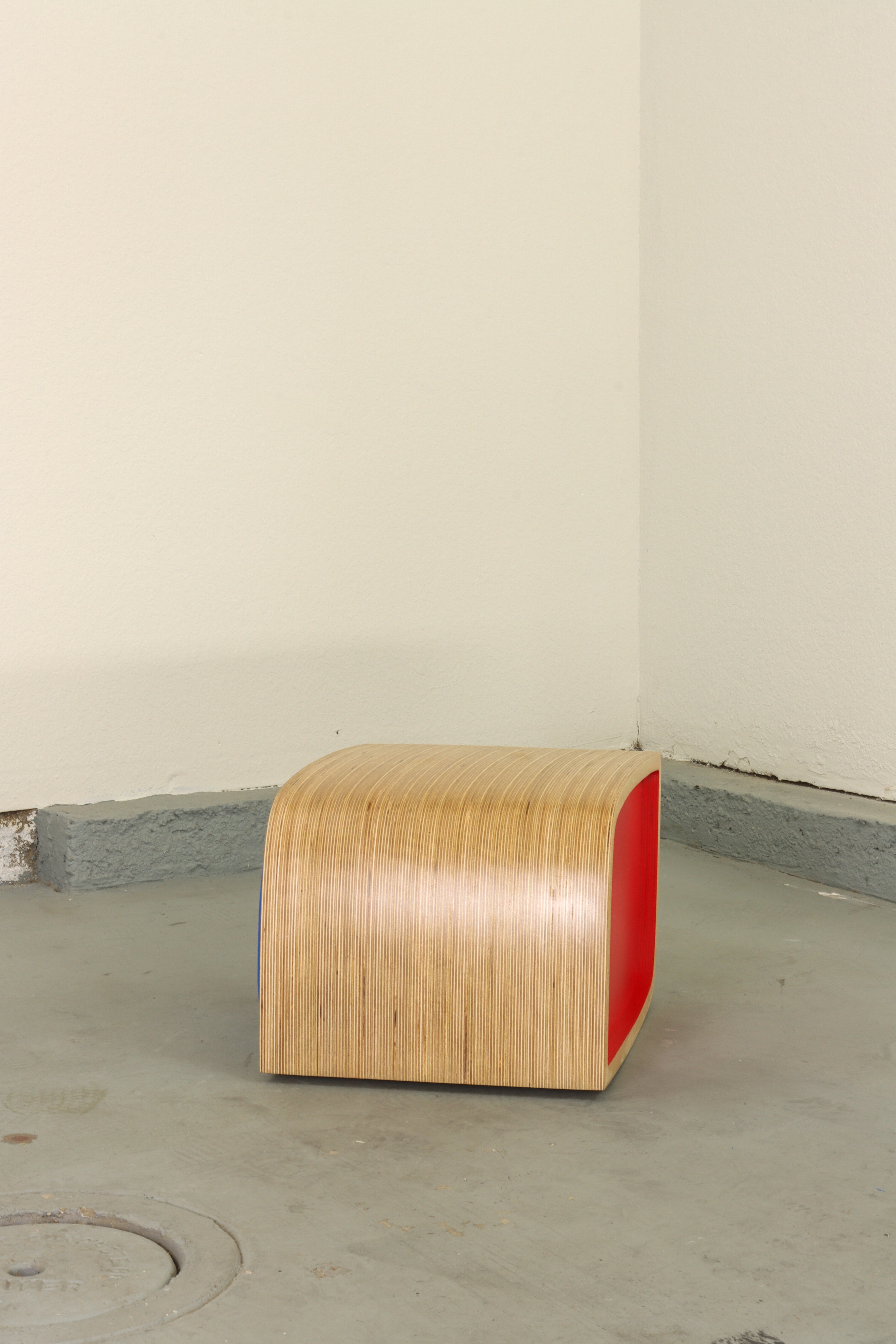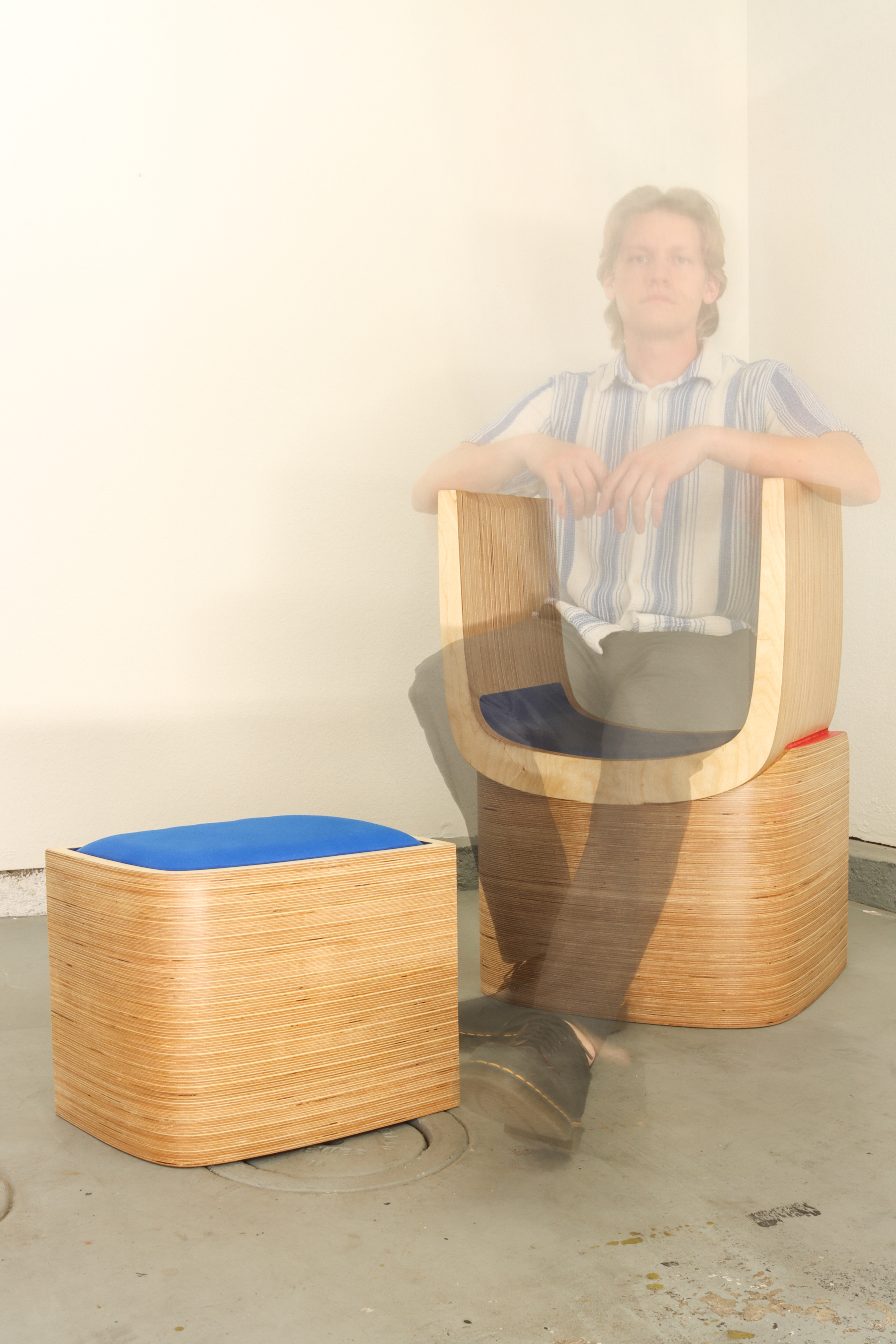 This small set of furniture was designed entirely out of 3/4" Baltic Birch plywood, and used exactly 3 sheets with minimal waste. The original concept for this piece was to design a robust seating arrangement. With this chair, one can sit in 6 different positions, depending on how the chair is oriented. The small side table/foot rest/stool was made out of the scraps left over from the larger U shapes, and is hollow on the interior for weight reduction. This piece can be sat on in two different orientations, used as a foot rest in two orientations, or be used as a side table. James was inspired by Dutch Modernism, and artists of the De Stijl movement, like Gerrit Rietveld, Piet Mondrian, and loosely, Kazimir Malevich. Gerrit Rietveld's furniture has been described as "the end of comfort", and all artists work comprises of the reduction of form and color to the basic and primary. These aspects were partially a guiding principal in this Plywood Set. Picture frame is made from an extra five layers of plywood rings from the side object. Artwork within frame created by Adriano D'Angelo.