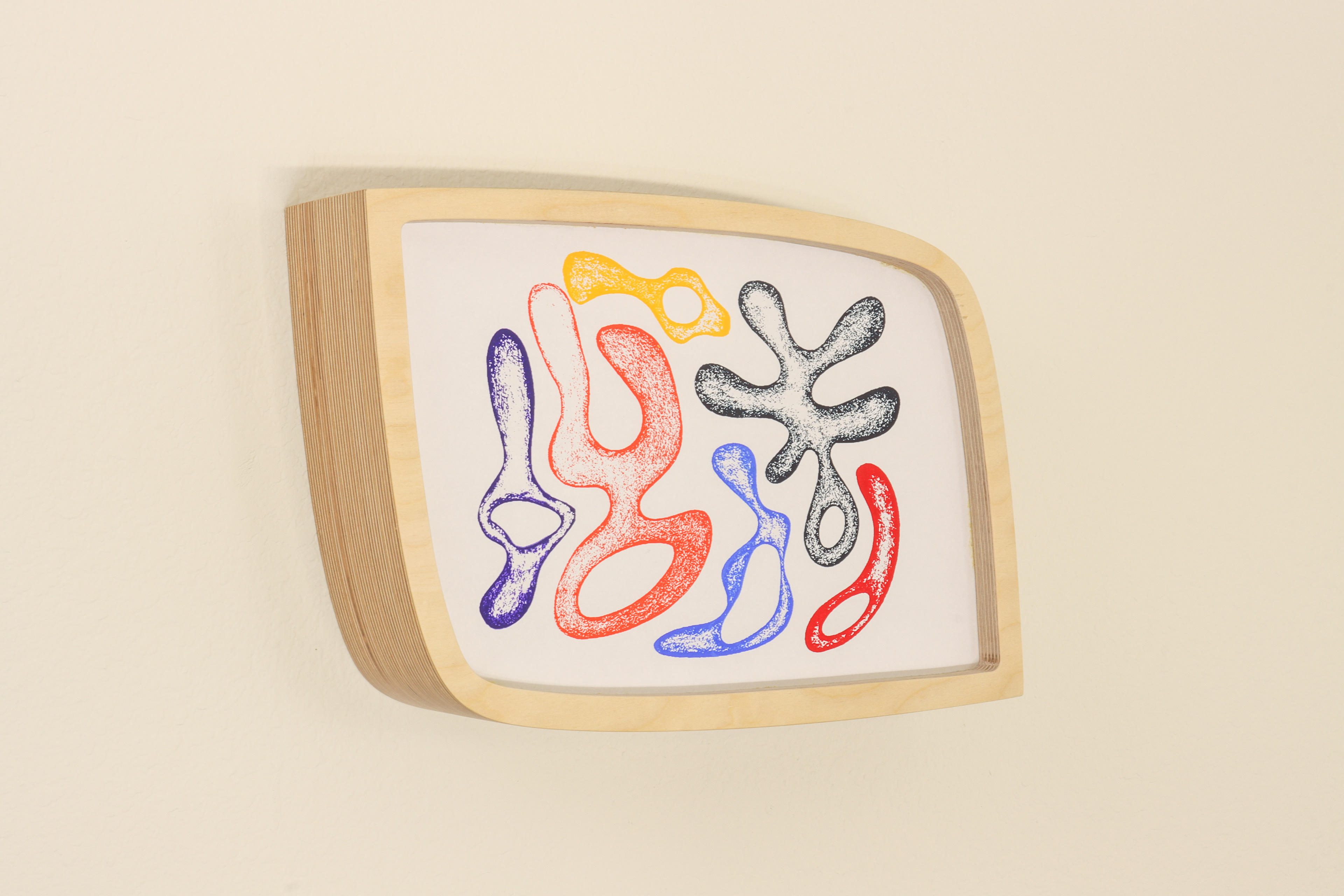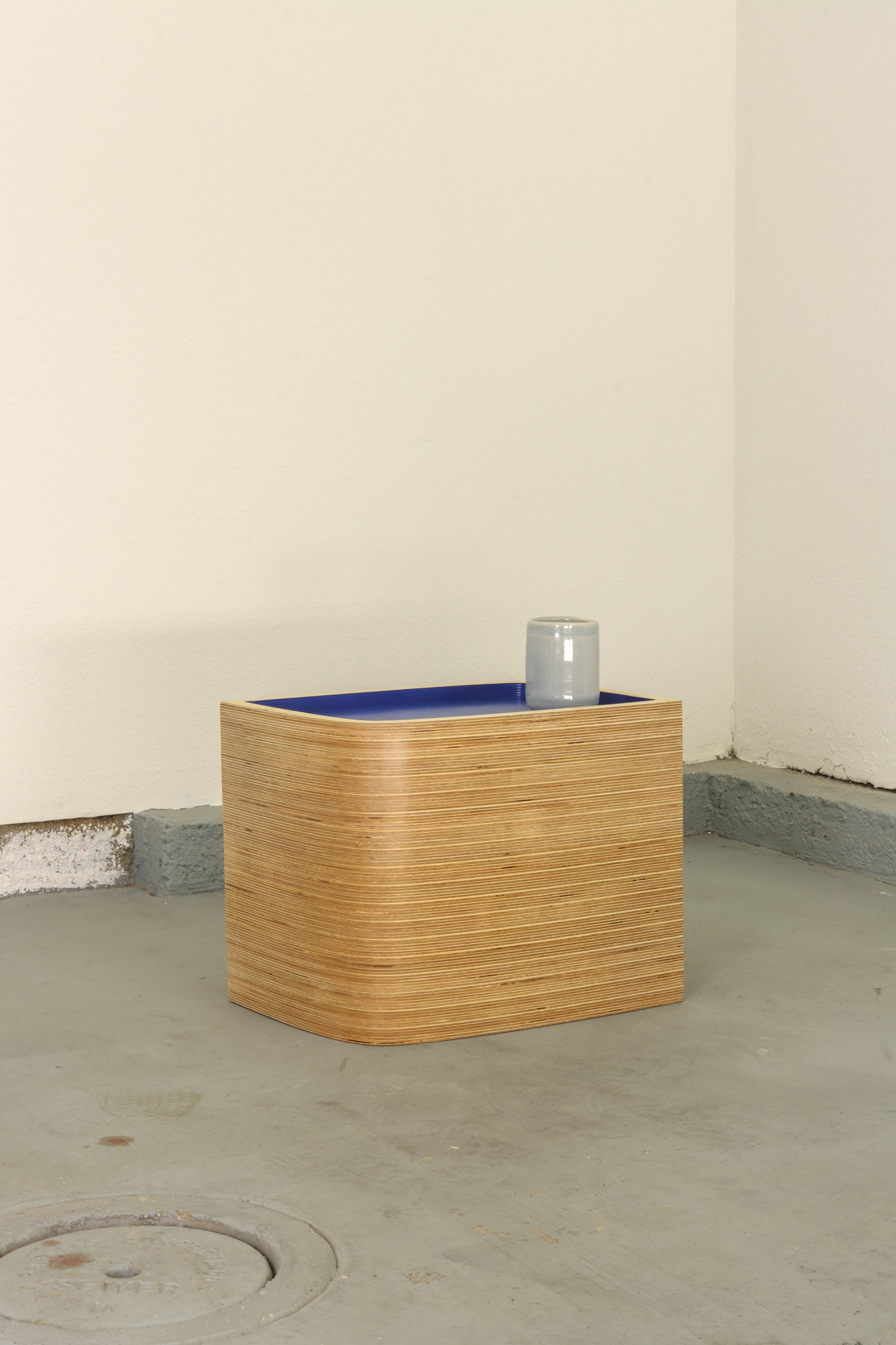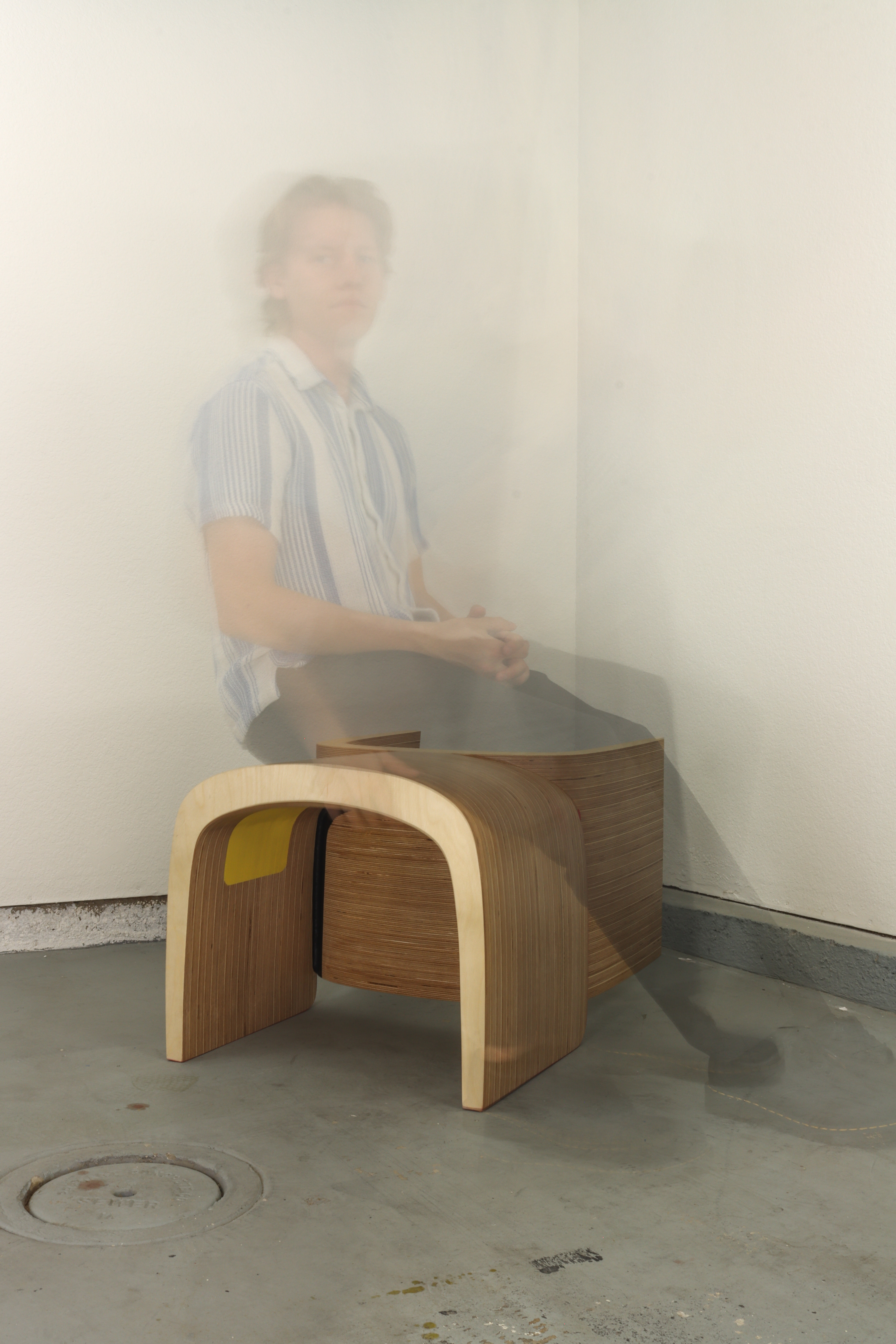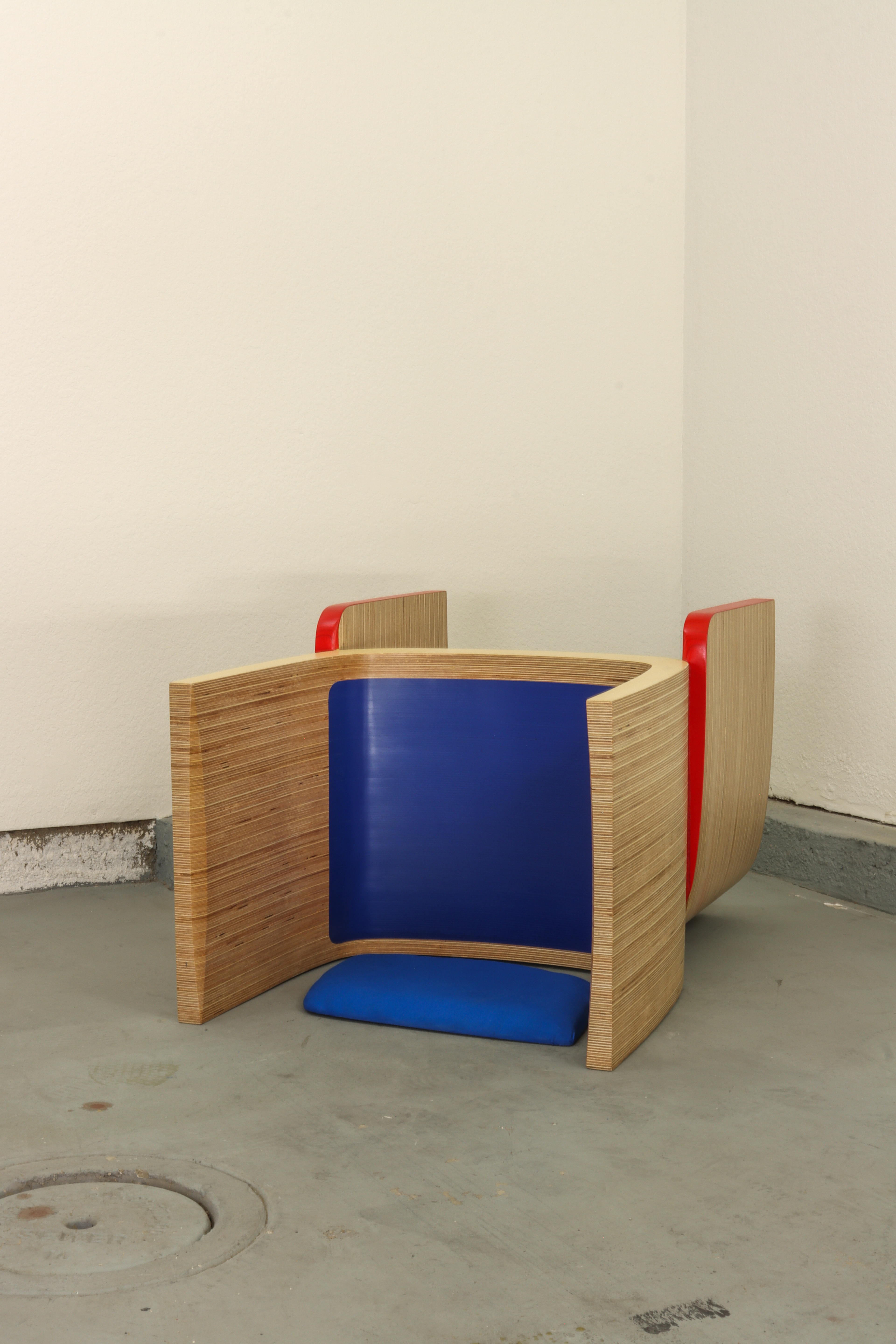 This small set of furniture was designed entirely out of 3/4" Baltic Birch plywood, and used exactly 3 sheets with minimal waste. The original concept for this piece was to design a robust seating arrangement. With this chair, one can sit in 6 different positions, depending on how the chair is oriented. The small side table/foot rest/stool was made out of the scraps left over from the larger U shapes, and is hollow on the interior for weight reduction. This piece can be sat on in two different orientations, used as a foot rest in two orientations, or be used as a side table. James was inspired by Dutch Modernism, and artists of the De Stijl movement, like Gerrit Rietveld, Piet Mondrian, and loosely, Kazimir Malevich. Gerrit Rietveld's furniture has been described as "the end of comfort", and all artists work comprises of the reduction of form and color to the basic and primary. These aspects were partially a guiding principal in this Plywood Set. Picture frame is made from an extra five layers of plywood rings from the side object. Artwork within frame created by Adriano D'Angelo.